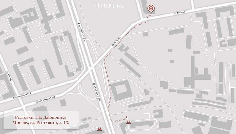 С МКАД — на Алтуфьевское ш., через 7,5 км вправо, на ул. Комдива Орлова, ул. Милашенкова и ул. Добролюбова. Через 800 м поворот вправо, на ул. Руставели, к ресторану.