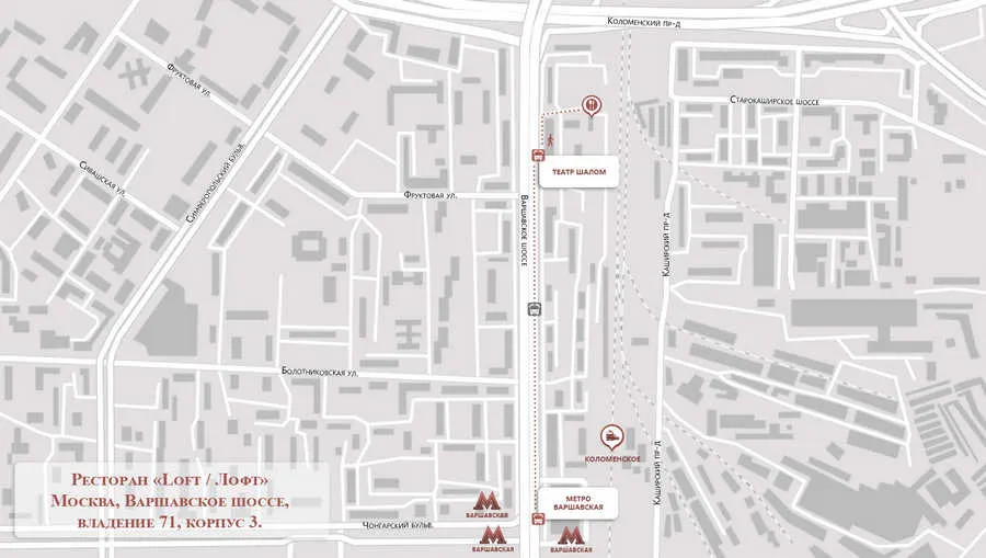 От станции метро «Варшавская» на автобусах №№ 142, 147 или троллейбусе № 40 проехать до «Театра Шалом» (2 ост.) и пройти к ресторану 200 м.