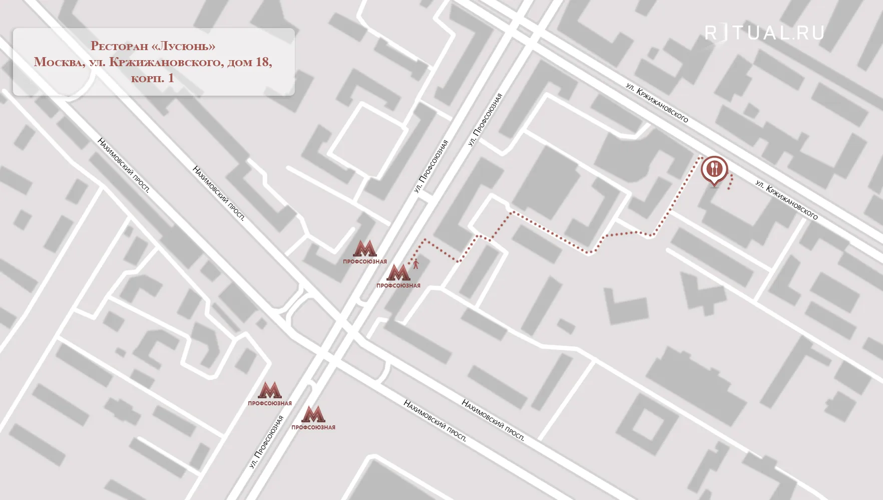 Пройти по Профсоюзной улице (в сторону центра) до пересечения с улицей Кржижановского. Повернуть направо на улицу Кржижановкого. Через три дома справа здание ресторана.