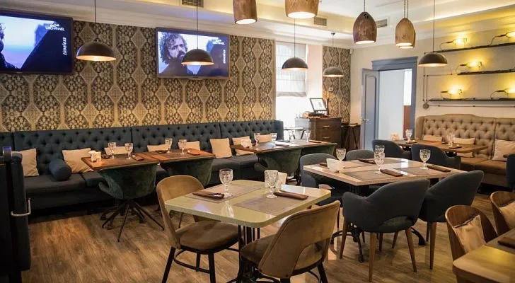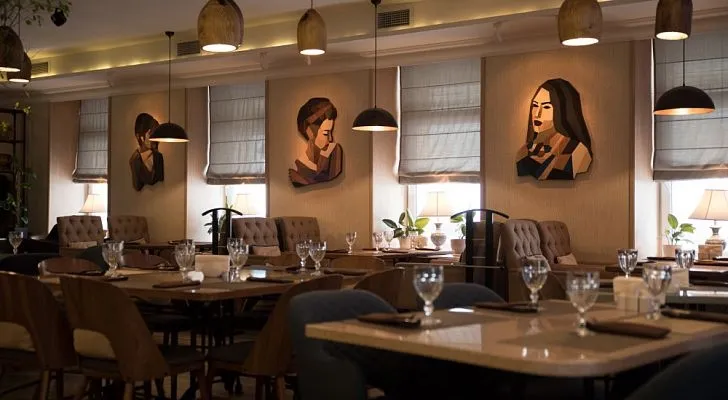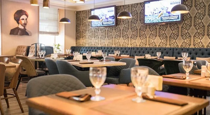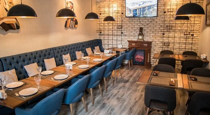 Ресторан «Modi/Моди» приглашает своих гостей в благородно-сдержанные интерьеры, где серо-голубые, синие и бежевые тона гармонично сочетаются с мозаичным орнаментом, барельефами и живописными полотнами.