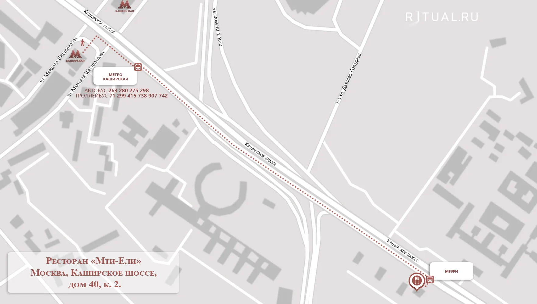 С ТТК съезд на Варшавское шоссе. Прямо 3,1 км, далее левее на Каширское шоссе. Проехать 4 км и свернуть направо на ул. Святослава Рихтера. Через 80 м направо к ресторану «Мти-Ели».