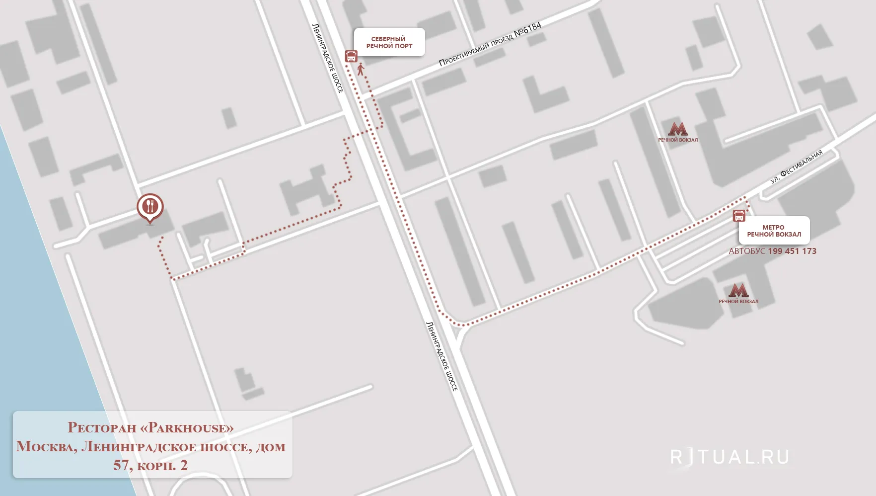 От ТТК по Ленинградскому проспекту 1,3 км. Далее правее на Ленинградское шоссе. Прямо по Ленинградскому шоссе до парка Северного речного вокзала, на территории которого находится ресторан.