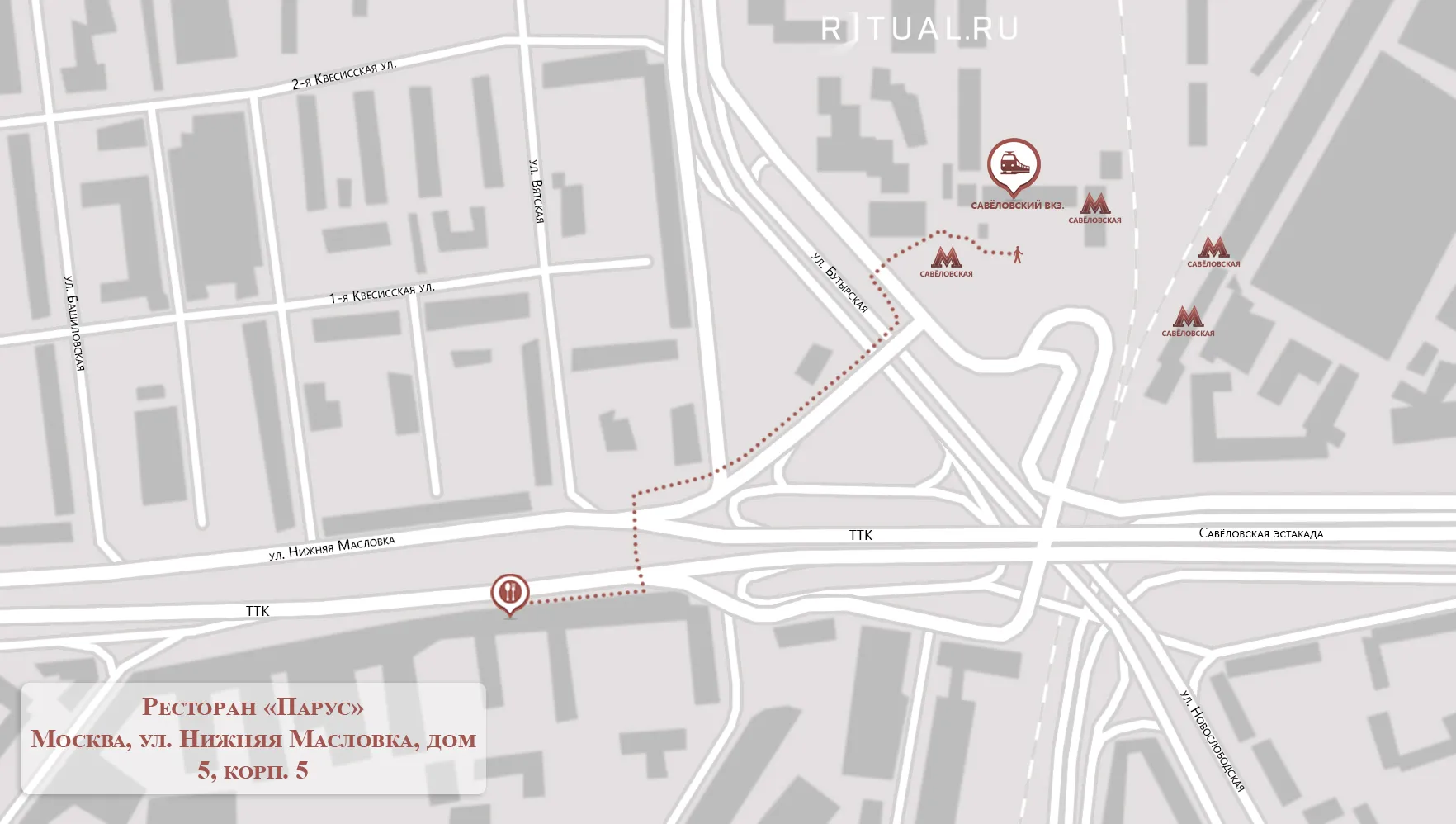 С ТТК съезд на улицу Нижняя Масловка (перед Савёловской эстакадой). Проехать 700 м по улице Нижняя Масловка до заезда к дому № 5, корп. 5, в котором расположен ресторан.Заказ поминок в ресторане