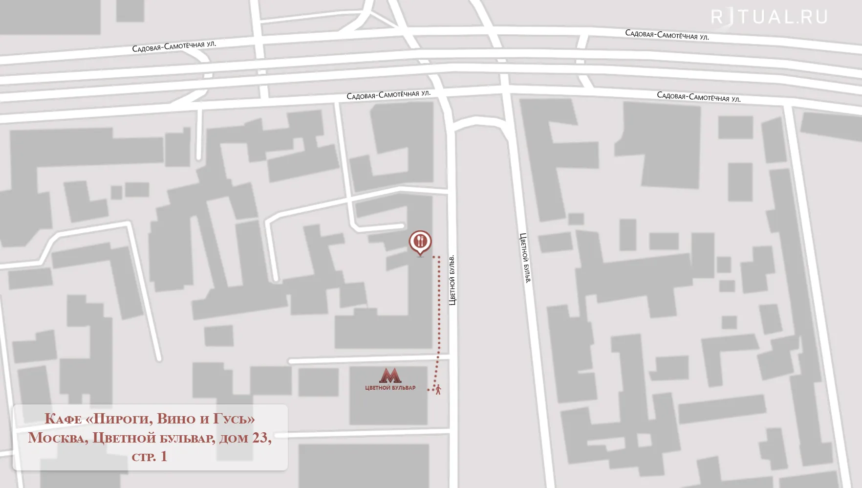 От Садового кольца (Садовая – Самотёчная улица) съехать на Цветной бульвар. Через 110 м с правой стороны расположен ресторан «Пироги, Вино и Гусь».