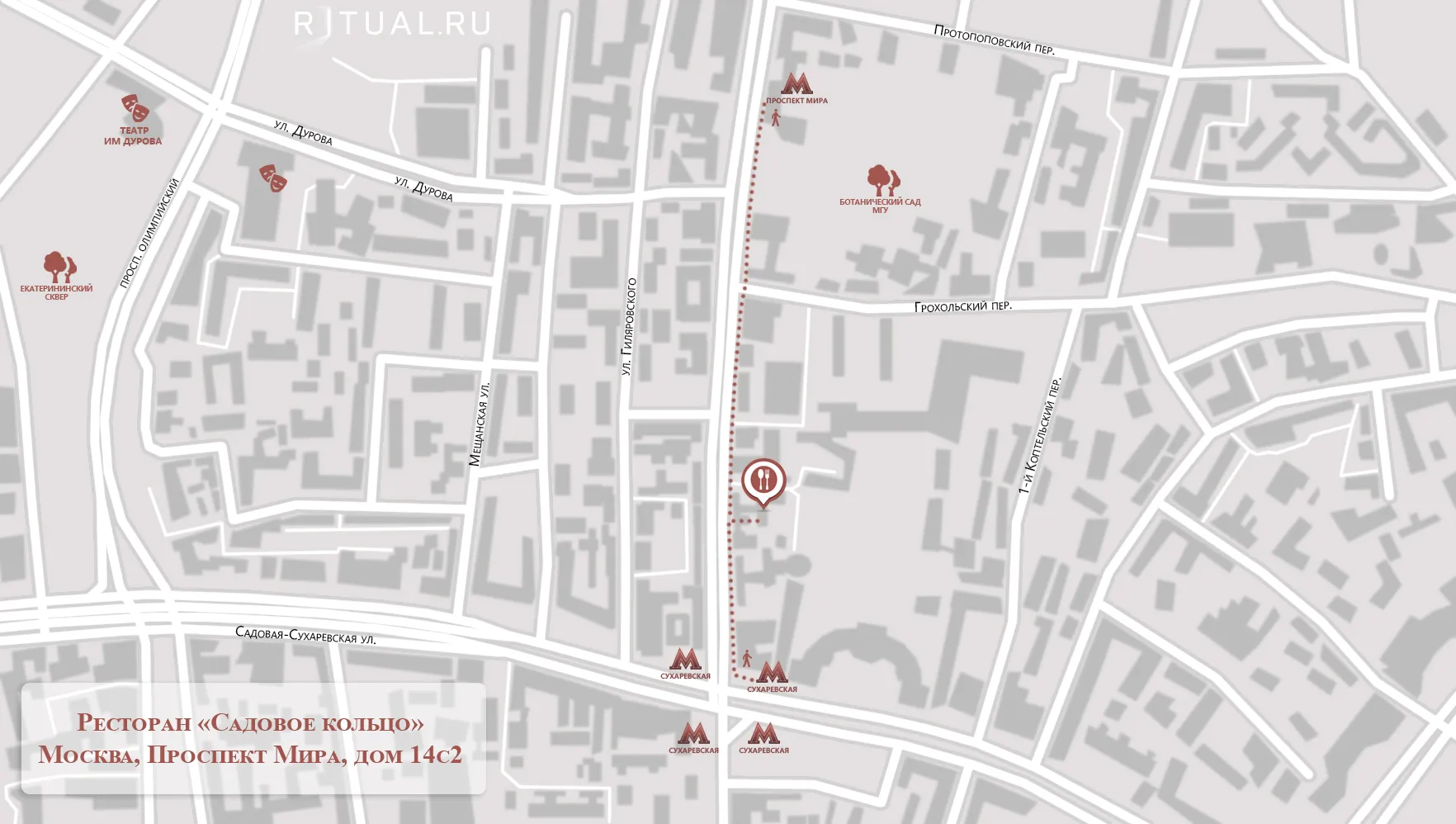 От Садового кольца и из Центра проехать по проспекту Мира 280 м и повернуть направо во двор за музеем «Садовое кольцо» (дом №14). Подъезд к отелю, при котором находится ресторан, со двора.