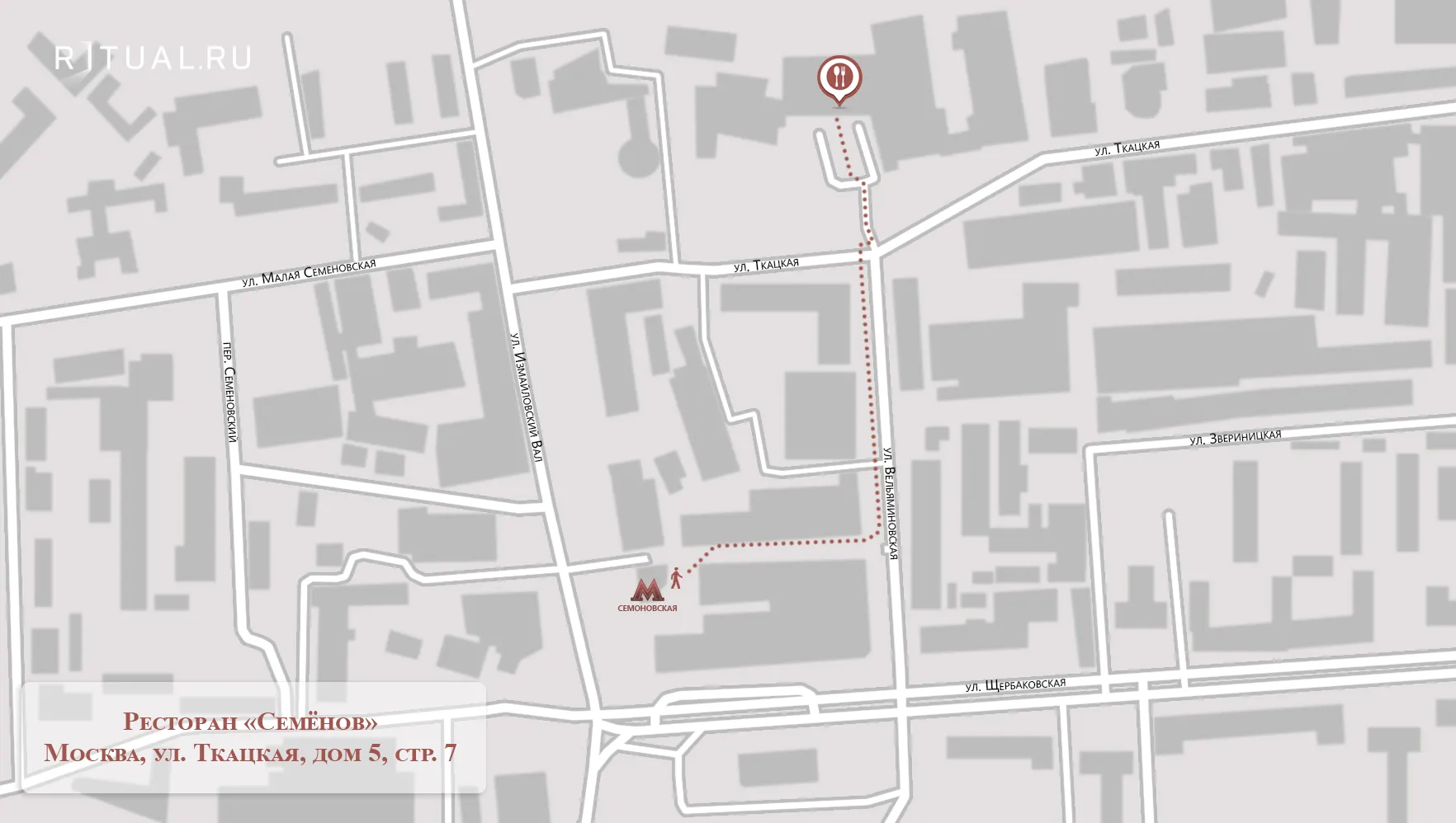 Из выхода метро правее до Вильяминовской улицы. Далее налево до Ткацкой улицы. Напротив, через дорогу расположен банкетный зал «Семенов», который находится на территории развлекательного комплекса.