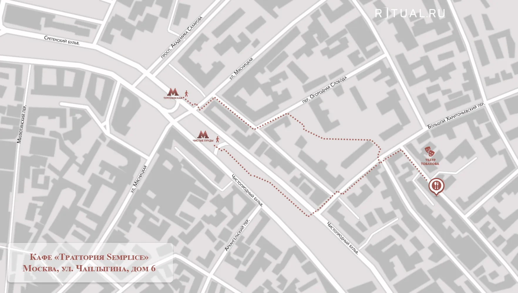 Метро «Тургеневская», пешком 9 минут. По Бульварному кольцу до Большого Харитоньевского пер. Далее направо на улицу Чаплыгина. Через 430 м напротив Московского театра О. Табакова находится здание ресторана.