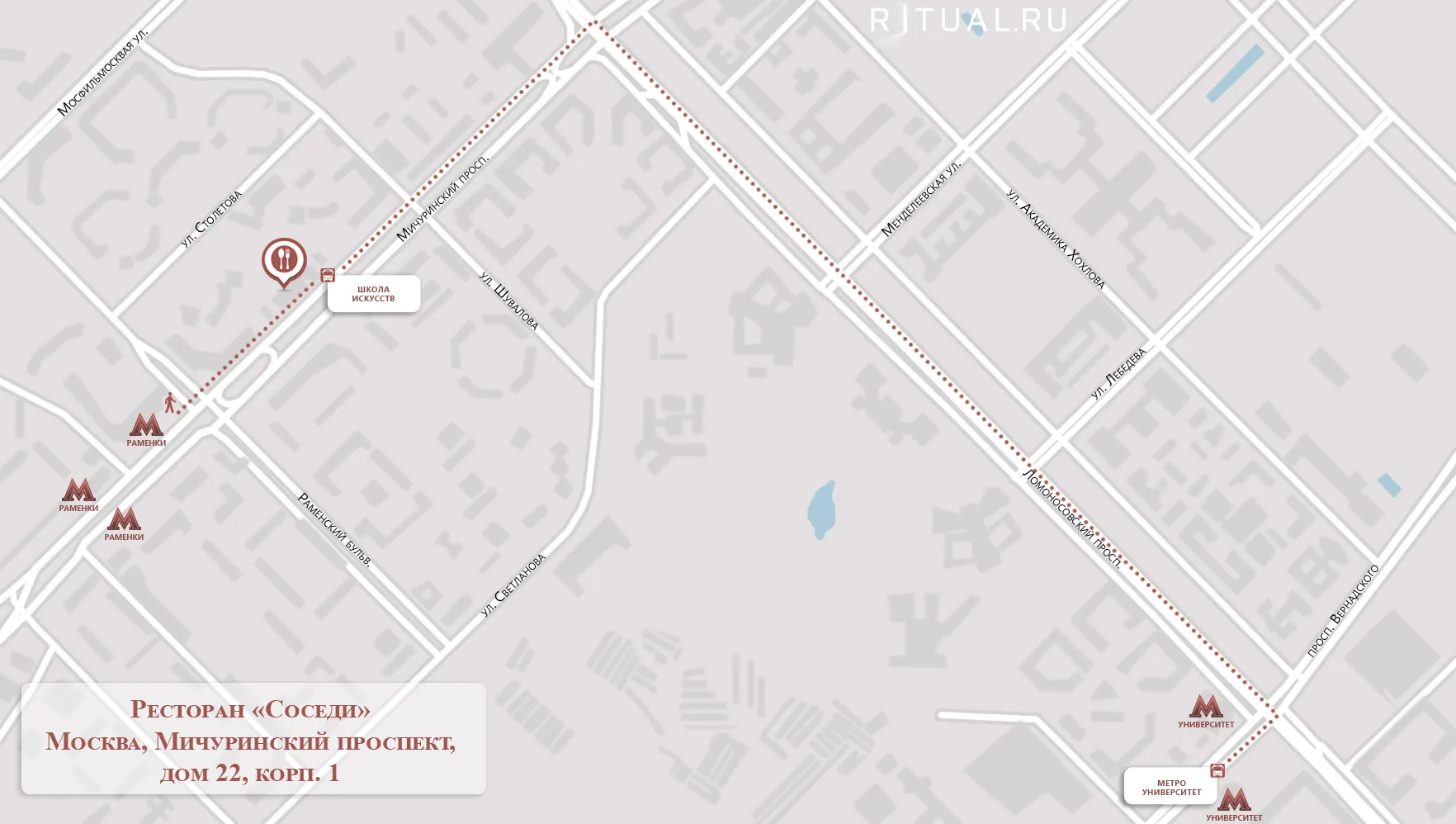 С ТТК съезд на Мосфильмовскую улицу. Через 3 км налево на дублёр Ломоносовского проспекта. Проехать 670 м и повернуть направо на Мичуринский проспект. За домом № 22 по Мичуринскому проспекту заезд к ресторану.