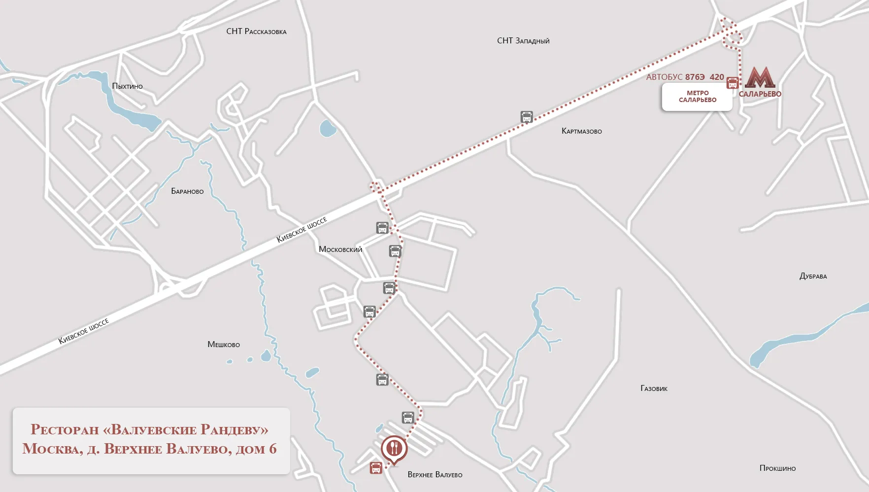 Метро «Саларьево», автобусы: 876 Э/420.