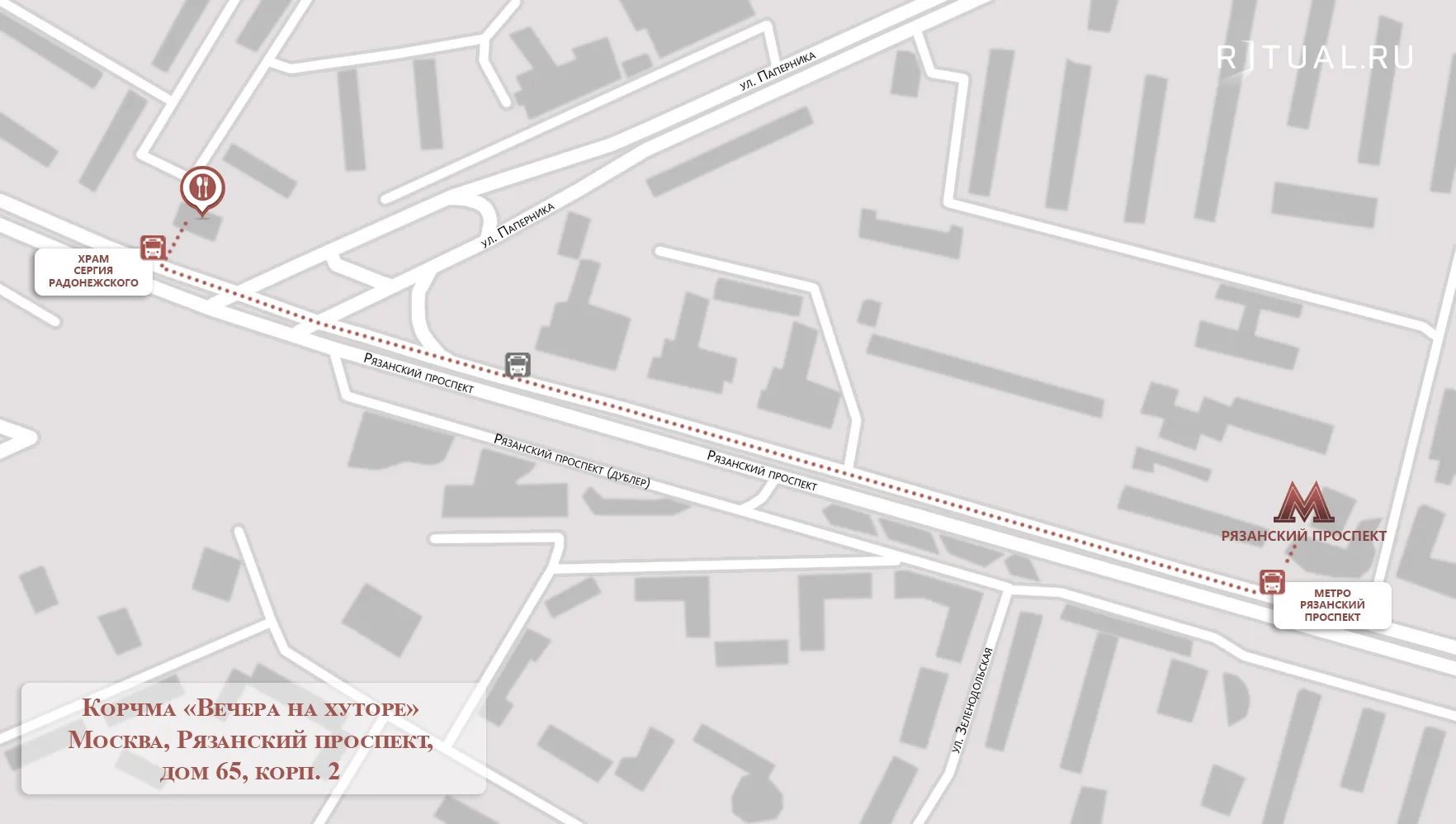 От МКАД (8-й км) съезд на Рязанский проспект. Прямо по Рязанскому проспекту.Через 3,3 км заезд к ресторану «Вечера на хуторе».