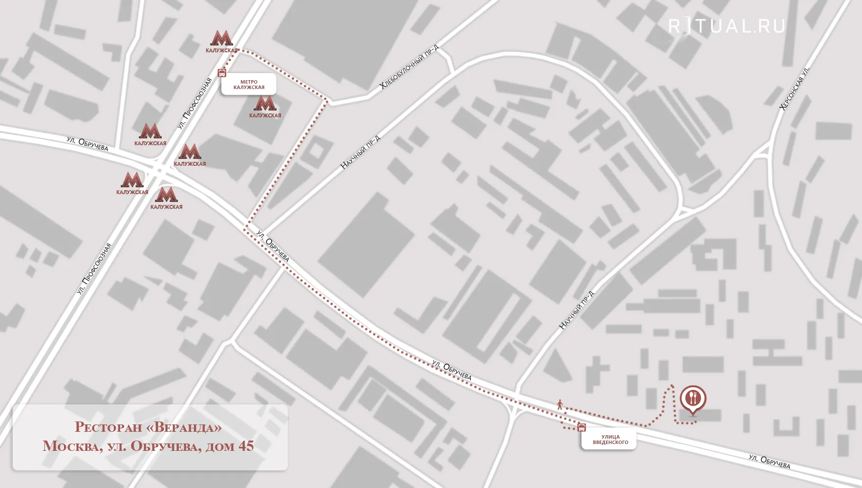 Ост. «Улица Введенского», пешком 6 минут. От остановки перейти улицу Обручева и пройти вперед до входа в ресторан.
