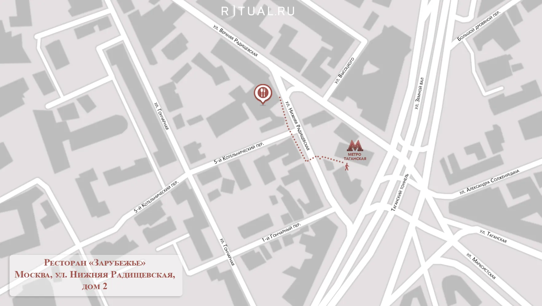 С Таганской площади налево. Далее по левой стороне Нижней Радищевской улицы до входа в ресторан.